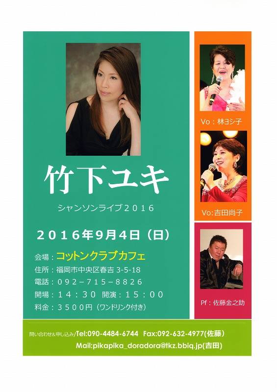![]() 楽しい年末にいたしましょう!! 12月1日(木) 国分寺「Paris Kidori」 パリのカフェ風のステキなライブです。 18:30〜3回ステージ ピアノ上里知己 チャージ¥5000(ドリンク別) 042-316-8535 http://www.pariskidori.tokyo/ 12月2日(金) 新橋「内幸町ホール」 銀巴里アワー「シャンソネットスペシャル」 9名のベテラン&中堅シャンソン歌手出演 昼の部 開場13:00 開演13:30 チケット制¥5000 12月2日(金) 新宿「ヴィラージュ」 ピアノ三浦高広 19:30〜3回ステージ ¥5500(1ドリンク付き) 03-3357-3007(新宿中央通り商店街) http://members3.jcom.home.ne.jp/village2/ 12月7日(水)上野「ライブスペースQUI」 毎年恒例『KAYO&YUKI クリスマス★ウナギ★ディナーショー』 ピアノ森丘ヒロキ ベース岸徹至 開場18:30(お食事) 開演19:30 ¥11000【フリードリンク+鰻会席弁当(チャージ・税込み)】要予約 12月13日(火) ヒルトンホテル東京1F「セントジョージ・バー」(新宿都庁前) 19:45〜4回ステージ チャージ¥1200(飲食別) JAZZ http://www.hiltontokyo.jp/restaurants/st_georges_bar 12月15日(木) 自由が丘「サロンラマンダ」 マンスリー・コンサート(充実のソロライブです。) 19:00〜2回ステージ ピアノ上里知己 チャージ¥5000(ドリンク別) 03-3724-9959 http://www.lamanda.co.jp/ 12月16日(金) 市川「沙羅」初出演 ちょっと早めのクリスマスコンサートです。 14:00開場/14:30開演 ピアノ上里知己 ¥5400(ワンドリンク、オードブル付、税込) http://concert-sara.com/ 12月20日(火) 新宿「ヴィラージュ」 19:30〜3回ステージ ピアノ三浦高広 ¥5500(1ドリンク付き) 03-3357-3007(新宿中央通り商店街) http://members3.jcom.home.ne.jp/village2/ 12月21日(水) 銀座「天使のコンチェルト」 オーナー千羽愛子さん・米田まりさんとの三人会 19:30〜3回ステージ ピアノ上里知己 チャージ¥6000(ドリンク別) 03-3575-1313 http://tenshi-no-concerto.com/ 12月22(木) ヒルトンホテル東京1F「セントジョージ・バー」(新宿都庁前) 19:45〜4回ステージ チャージ¥1200(飲食別) JAZZ http://www.hiltontokyo.jp/restaurants/st_georges_bar 12月25(日) ヒルトンホテル東京1F「セントジョージ・バー」(新宿都庁前) 19:45〜4回ステージ チャージ¥1200(飲食別) JAZZ http://www.hiltontokyo.jp/restaurants/st_georges_bar 12月28日(水) 銀座「CAFE IZUMI」スペシャル・ライブ ¥5500(お食事+1ドリンク) 開場18:30 開演19:15 予約制 03-3564-1082(カフェイズミ) http://www.ginza-inz.co.jp/?shopinfo=cafeizumi 12月29日(木) 国立「ハーバーライト」年忘れライブ 19:30〜2回ステージ チャージ¥2000 ピアノ 上里知己 http://www.harborlight.co.jp/ 12月31日(土) 池袋「メトロポリタンホテル」カウントダウン 25F「オーヴェスト」(予約制) 03-3980-1111 個人レッスン: @ 茅ヶ崎 080-5549-4285(高久) A 銀座 03-3575-1566(カンタータ) B 恵比寿 03-3791-1738(KYO) コーラスクラス: 読売文化センター町屋03-3802-7115にお問い合わせください。 2016年11月 ![]() みなさま風邪に気を付けて元気な11月を! 11月15日(火) 新宿「ヴィラージュ」 ピアノ三浦高広 19:30〜3回ステージ ¥5500(1ドリンク付き) 03-3357-3007(新宿中央通り商店街) http://members3.jcom.home.ne.jp/village2/ 11月16日(水) 銀座「天使のコンチェルト」 オーナー千羽愛子さん・米田まりさんとの三人会 19:30〜3回ステージ ピアノ上里知己 チャージ¥6000(ドリンク別) 03-3575-1313 http://tenshi-no-concerto.com/ 11月17日(木) 自由が丘「サロンラマンダ」 マンスリー・コンサート(充実のソロライブです。) 19:00〜2回ステージ ピアノ上里知己 チャージ¥5000(ドリンク別) 03-3724-9959 http://www.lamanda.co.jp/ 11月18日(金) 国分寺「Paris Kidori」 パリのカフェ風のステキなライブです。 18:30〜3回ステージ ピアノ上里知己 チャージ¥5000(ドリンク別) 042-316-8535 http://www.pariskidori.tokyo/ 11月19日(土) ヒルトンホテル東京1F「セントジョージ・バー」(新宿都庁前) ピアノ白土幾美 ベース伊藤潮 19:45〜4回ステージ チャージ¥1200(飲食別) http://www.hiltontokyo.jp/restaurants/st_georges_bar 11月22日(火) 銀座「ラウンジ・ゼロ」 「黄金猫とのコラボ 杉原葉子オリジナル作品を歌う」 開場18:00 開演19:30 チャージ¥3500(当日¥4000)飲食別 03-6274-6631 http://ginza-zero.jp/ 11月25日(金) 大阪「創徳庵」 ピアニスト吉田幸生との年に一度のセッション 開場19:00 開演19:30 チャージ¥4000(当日¥4500)ドリンク別 http://ameblo.jp/soutokuann/ 11月26日(土) 神戸「里夢」 ピアニスト吉田幸生との年に一度のセッション チャージ¥4000(当日¥4500)ドリンク別 会場14:00 開演14:30 http://www.ne.jp/asahi/music-hall/satom/ 11月29日(火) 銀座「蛙たち」 ピアノ小林岳五郎 19:30〜2回ステージ チャージ¥4000 http://www.kaerutachi.jp/ 個人レッスン: @ 茅ヶ崎 080-5549-4285(高久) A 銀座 03-3575-1566(カンタータ) B 恵比寿 03-3791-1738(KYO) コーラスクラス: 読売文化センター町屋03-3802-7115にお問い合わせください。 2016年10月 ![]() 秋のひととき、楽しみましょうね!! 今月もよろしくお願いいたします。 10月4日(火) ヒルトンホテル東京1F「セントジョージ・バー」(新宿都庁前) 19:45〜4回ステージ チャージ¥1200(飲食別) Jazz&Pops http://www.hiltontokyo.jp/restaurants/st_georges_bar 10月5日(水) 上野「ライブスペースQUI」 KAYOさんとの爆笑コラボ。 ピアノ森丘ヒロキ パーカッショ